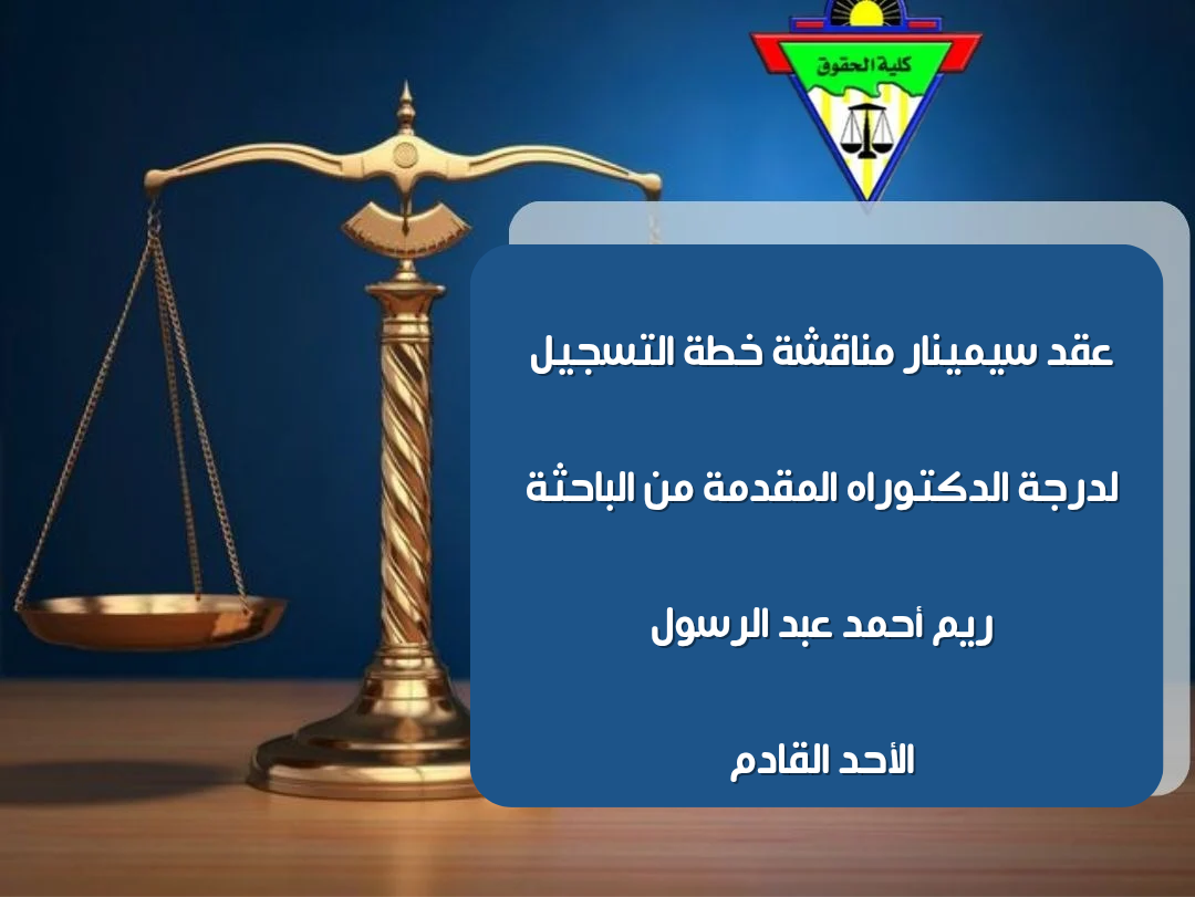 أعلن قسم القانون الدولى العام بالكلية عن عقد سيمينار مناقشة خطة التسجيل لدرجة الدكتوراه المقدمة من الباحثة / ريم أحمد عبد الرسول طه بعنوان