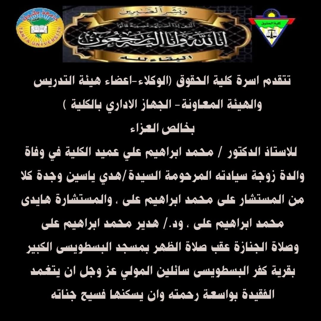 تتقدم اسرة كلية الحقوق الوكلاء - اعضاء هيئة التدريس والهيئة المعاونة - الجهاز الاداري بالكلية ) بخالص العزاء للاستاذ الدكتور / محمد ابراهيم علي عميد الكلية في وفاة