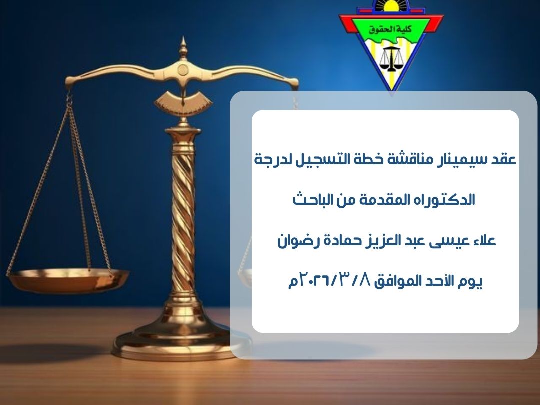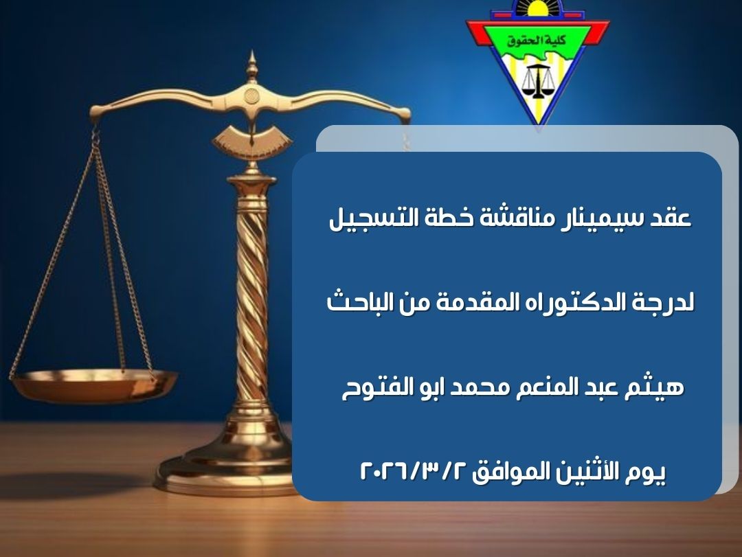 أعلن قسم القانون المدنى بالكلية عن عقد سيمينار مناقشة خطة التسجيل لدرجة الدكتوراه المقدمة من الباحثة / لمياء حاتم ابراهيم عبد النعيم