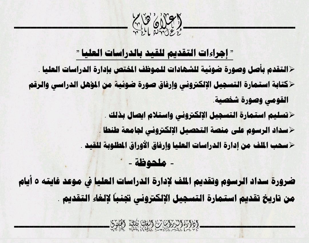 تعلن كلية الحقوق جامعة طنطا عن فتح باب القيد بدبلومات الدراسات العليا _ تاهيلي الدبلوم-تمهيدي الدكتوراه للعام الجامعي ٢٠٢٥/٢٠٢٦ اعتبارا من 15/1/2026 و لمدة شهر