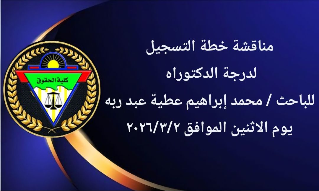 تحت إشراف الأستاذ الدكتور / أمين محمد أبو حمزة أستاذ ورئيس قسم القانون العام وذلك يوم الأحد الموافق ۲٠٢٦/۳/۸م في تمام الساعة الحادية عشر صباحاً .
