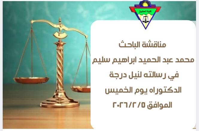 أعلنت كلية الحقوق جامعة طنطا عن تحديد يوم الخميس الموافق ٢٠٢٦/٢/٥ موعدا لمناقشة الباحث محمد عبد الحميد ابراهيم سليم، في رسالته لنيل درجة الدكتوراه، في موضوع: