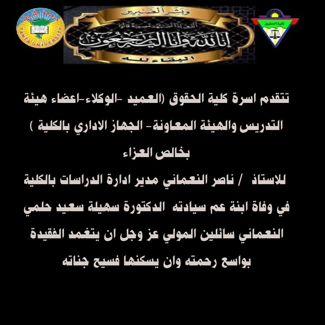 تتقدم اسرة كلية الحقوق (العميد -الوكلاء - اعضاء هيئة التدريس والهيئة المعاونة - الجهاز الاداري بالكلية ) بخالص العزاء للاستاذ / ناصر النعماني مدير ادارة الدراسات بالكلية