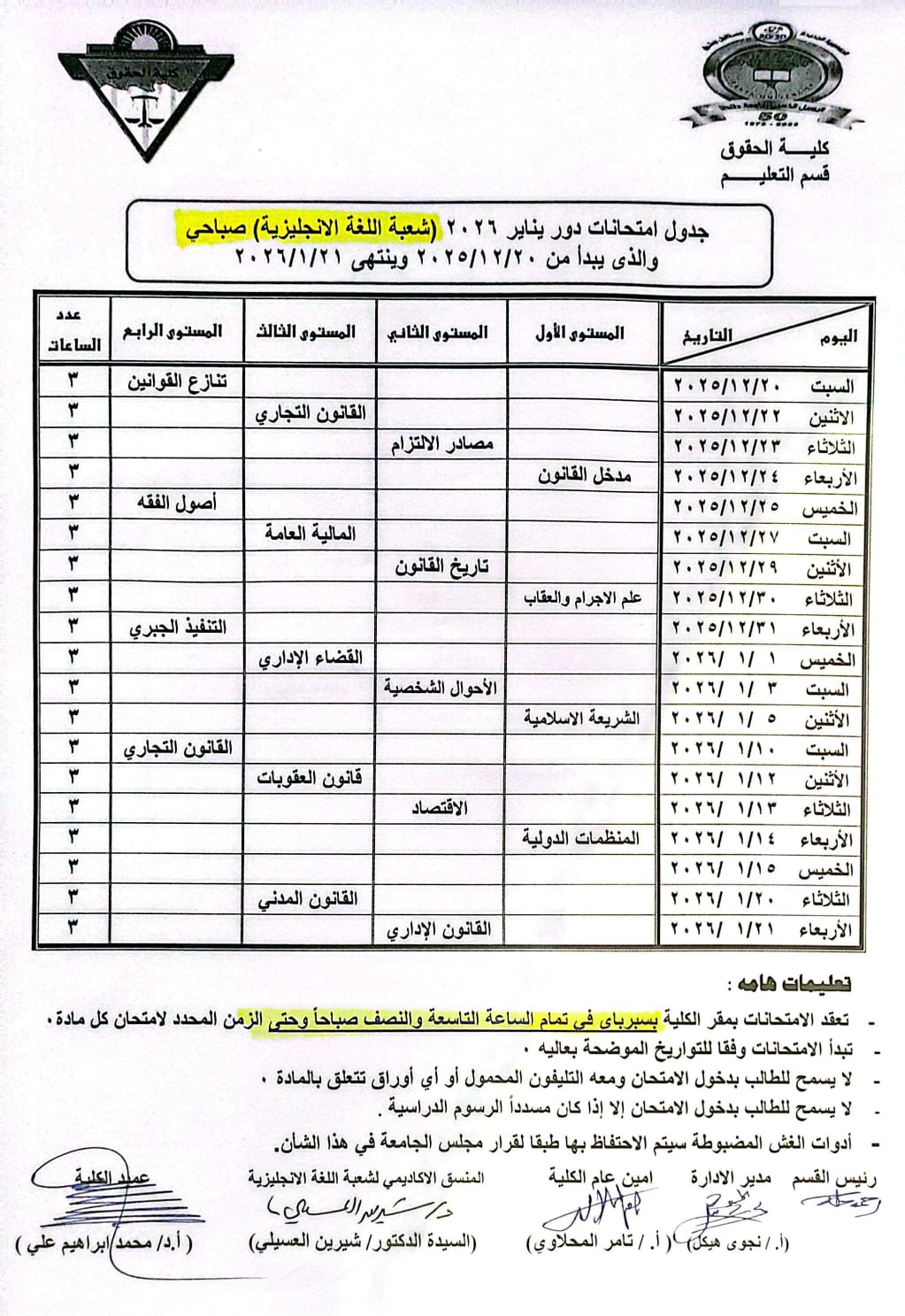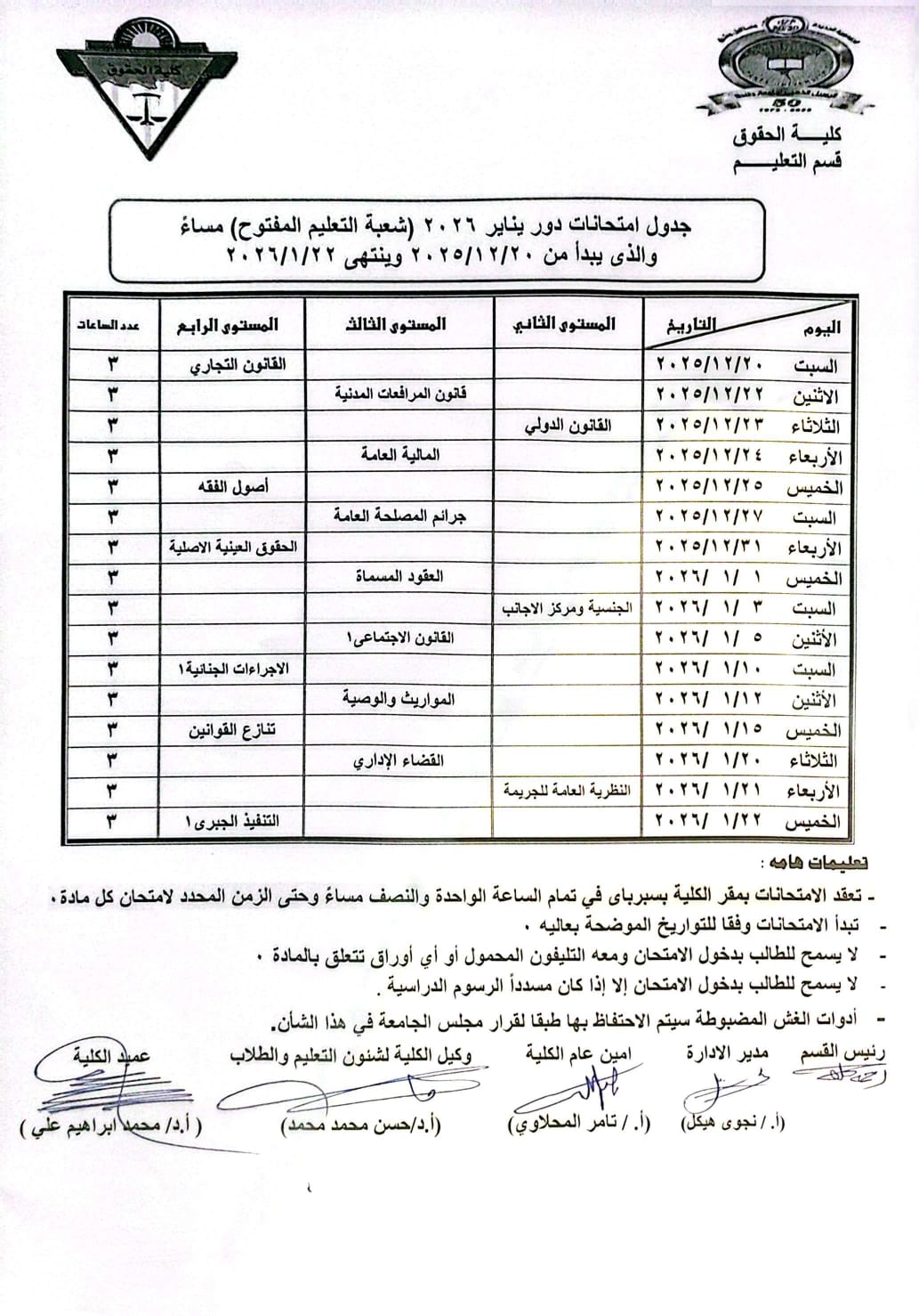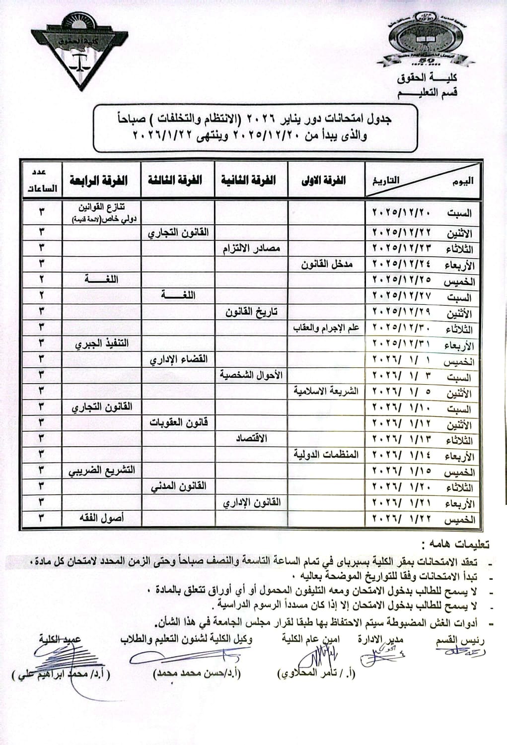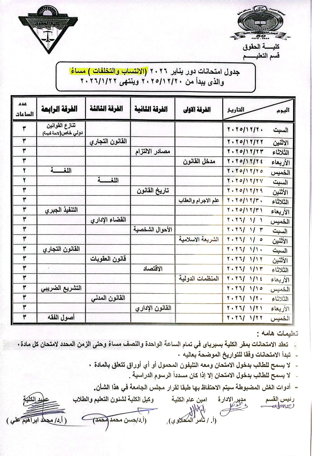 جداول امتحانات مرحلة جامعية لعام 2025-2026